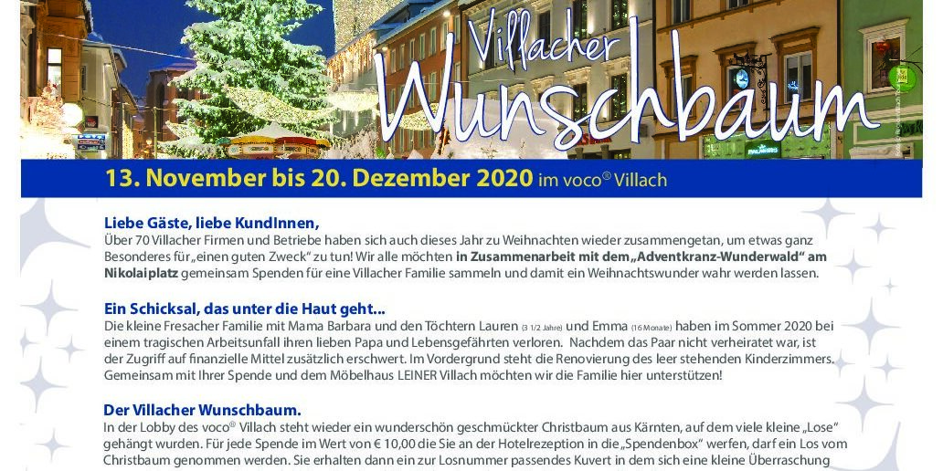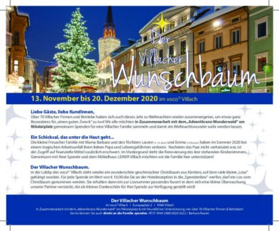Feb.92021CharityWunschbaum 2020 Wunschbaum 2020 voco Villach Alle Jahre wieder….. Auch 2020 war MelAmi am Wunschbaum im voco Villach vertreten! KommentarnavigationZurückVorheriger Beitrag:„G´sund & LeiLei“ Summertime2020 Kinderworkshop im Museum Villach